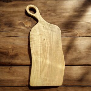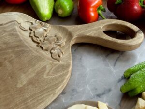 Krájecí deska vyrobena z ořechového dřeva s uchem a dekorací květu. Rozměry 53x26x2cm. Ošetřena olejem na kuchyňská prkýnka.